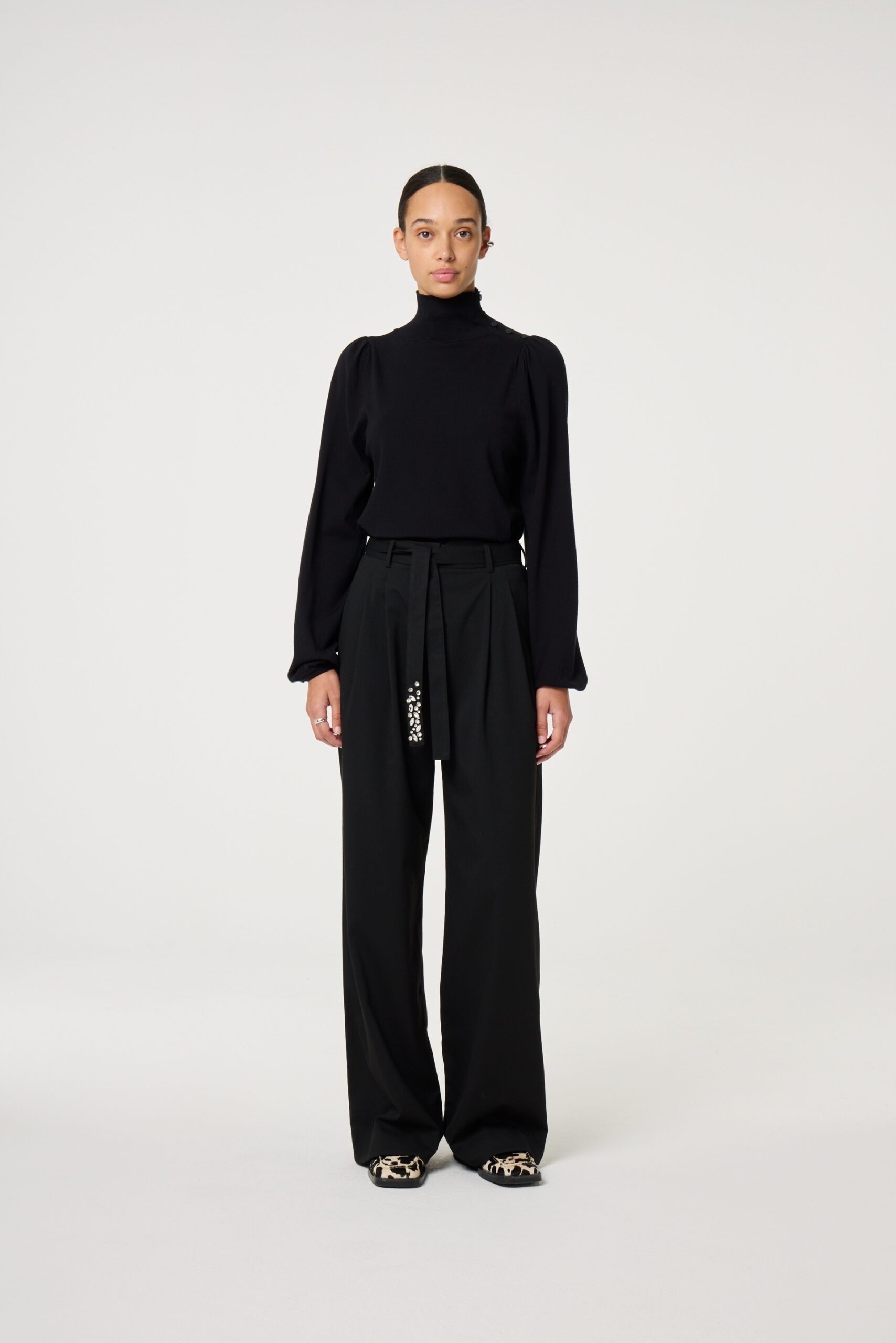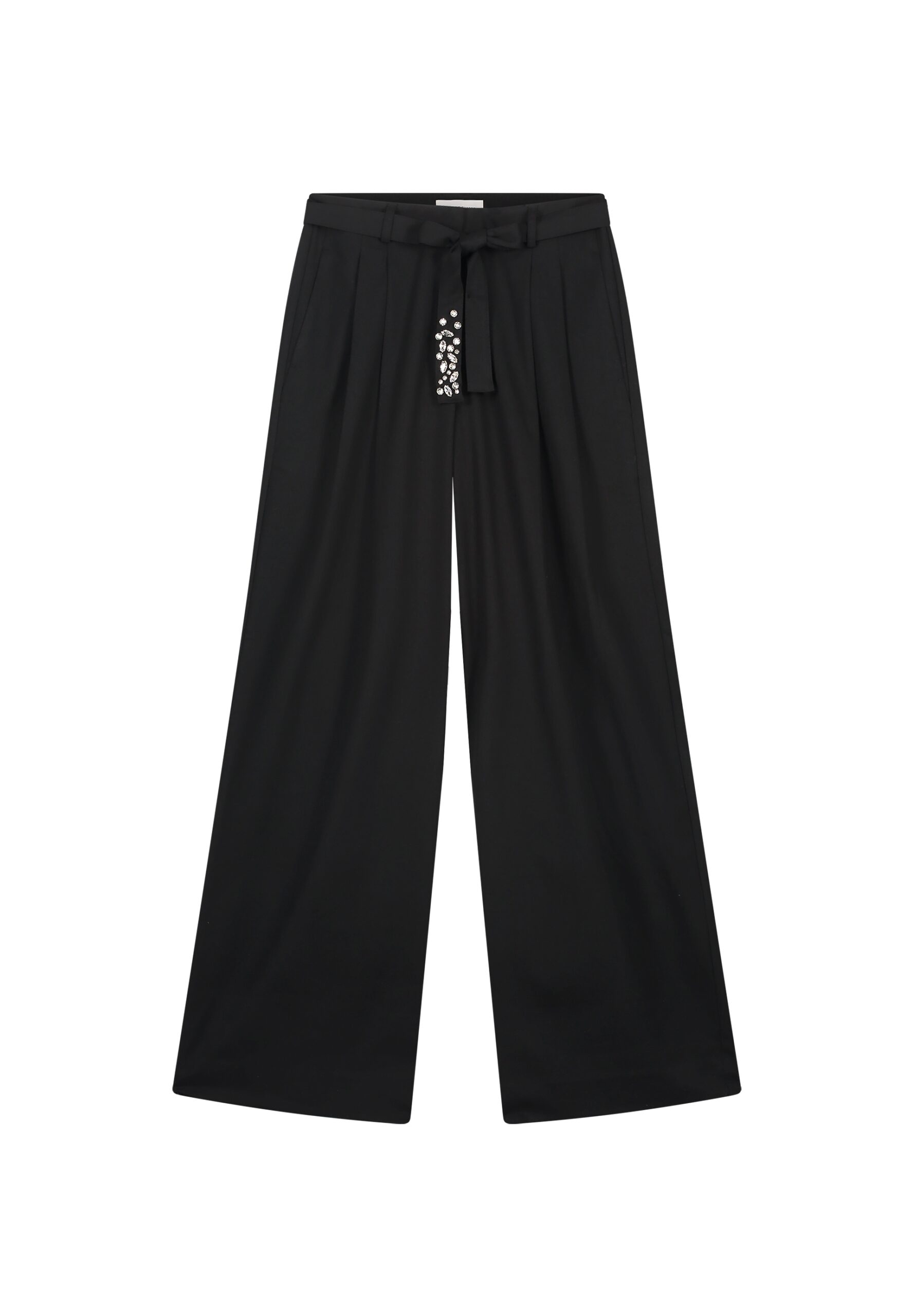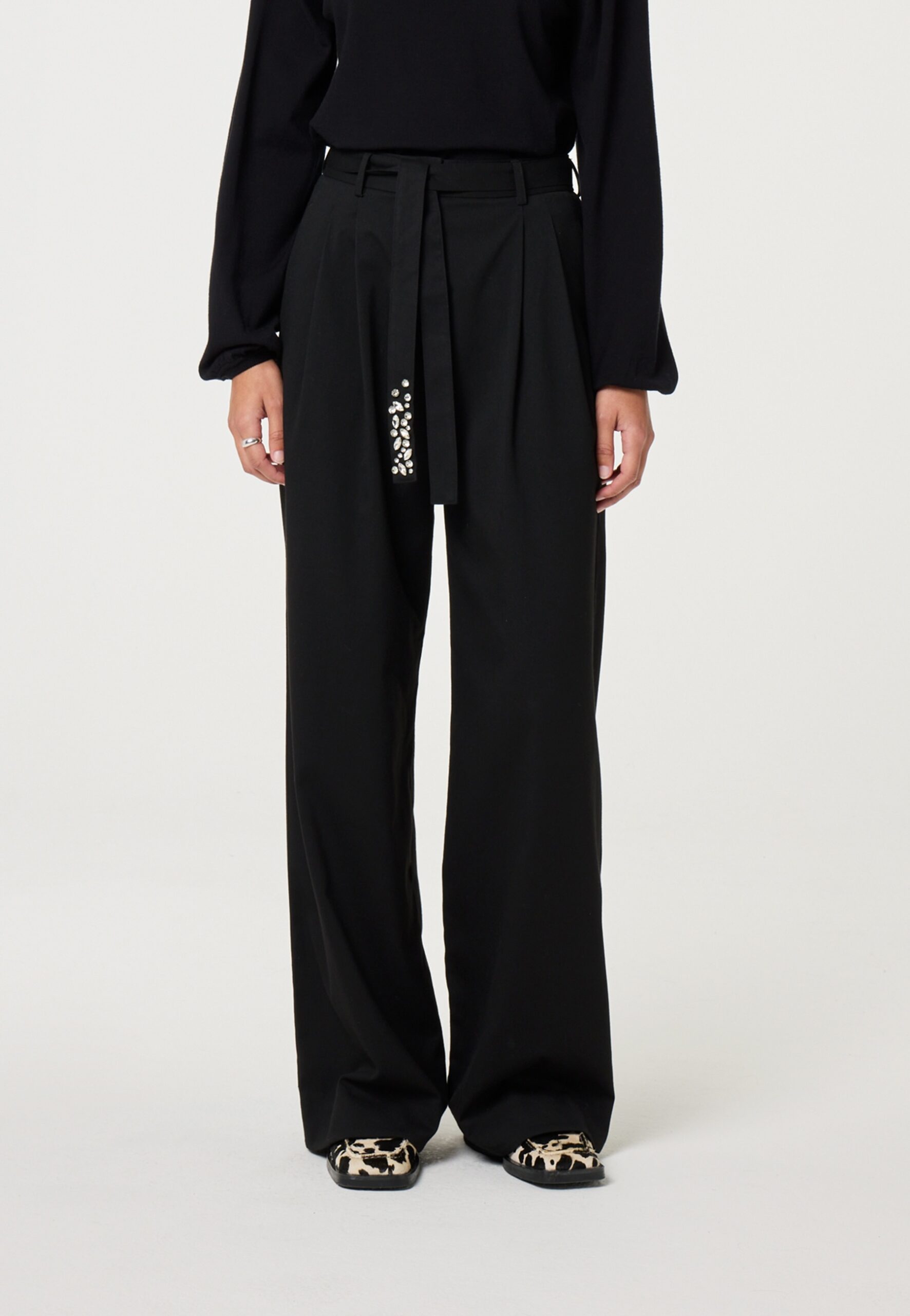 These Black fabric pants with a drawstring belt adorned with sparkling stones as a special detail. Their loose fit makes them comfortable to wear. Pair them with a simple T-shirt for an elegant yet sporty look.