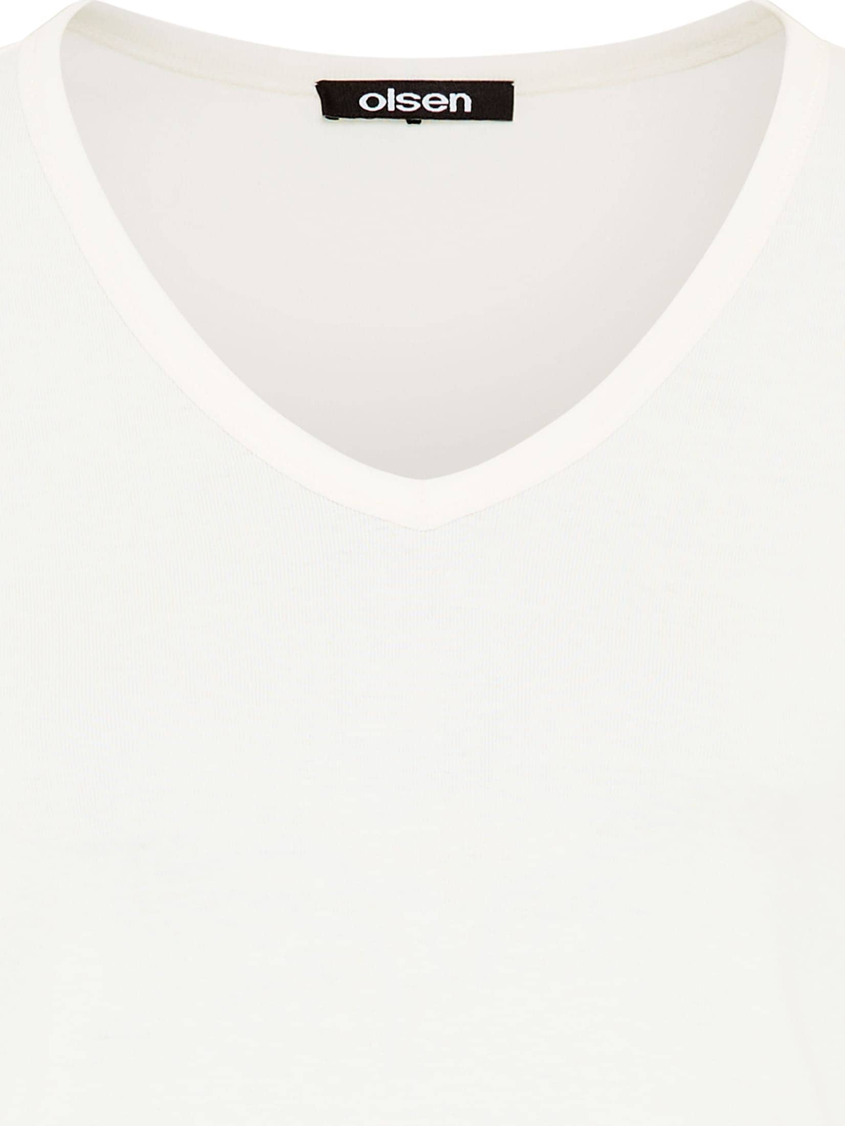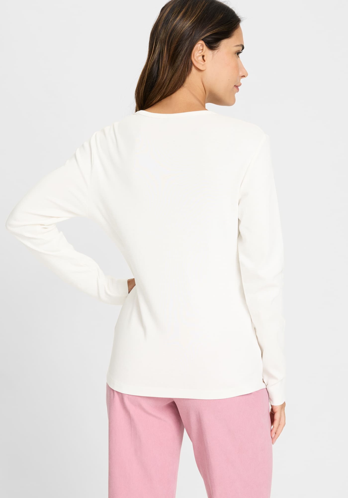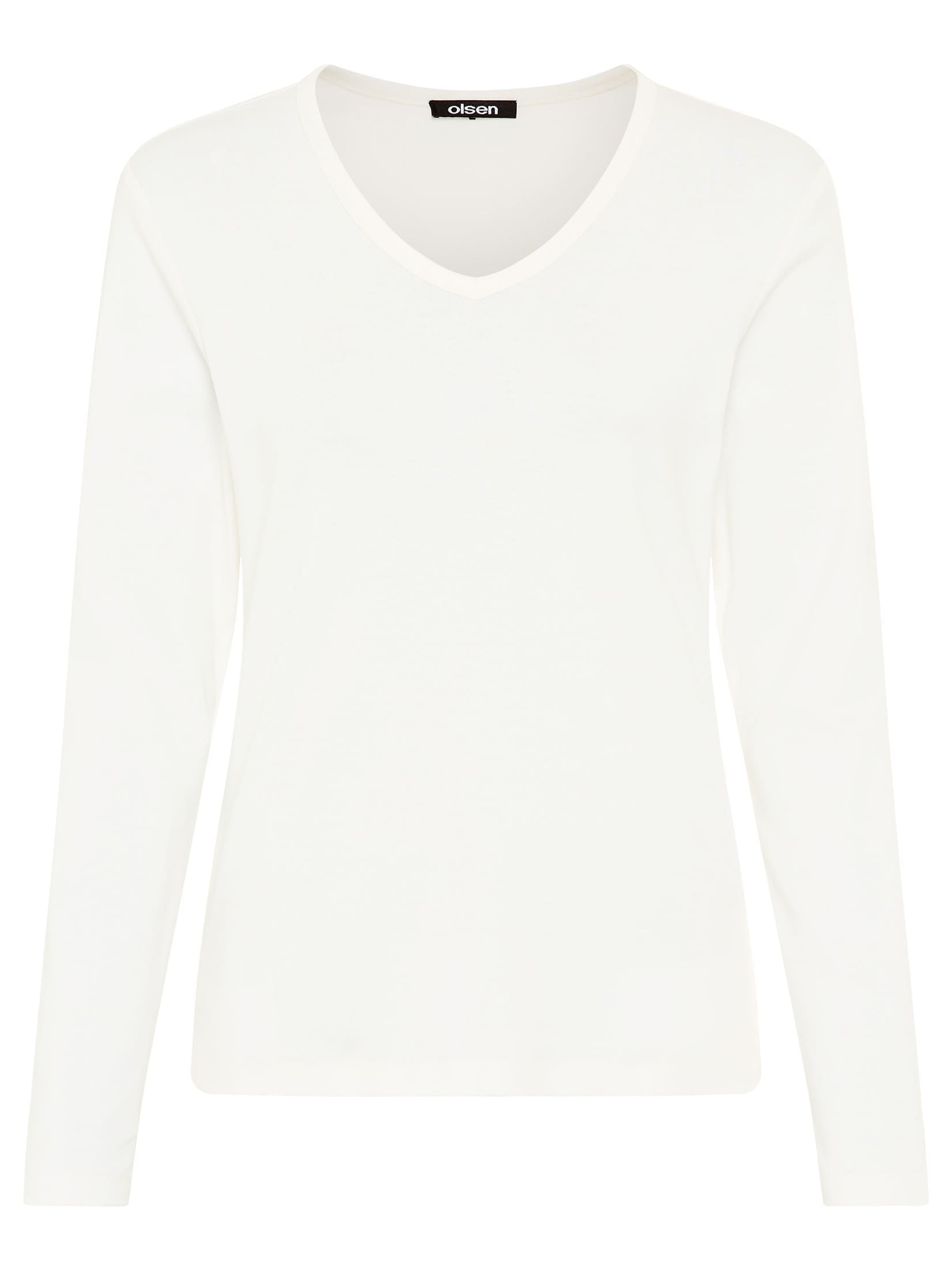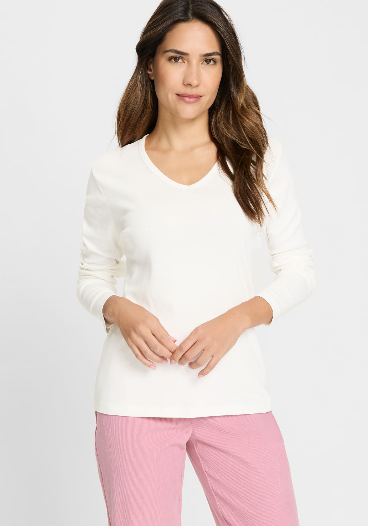 A classic white fitted blouse, crafted from 100% natural cotton. It features a subtle vertical stripe texture. The long-sleeved V-neck design beautifully accentuates the neck and works well under both a blazer and a cardigan. The slightly stretchy fabric makes the blouse comfortable and soft to wear, and its basic style makes it a perfect base for more statement pieces.