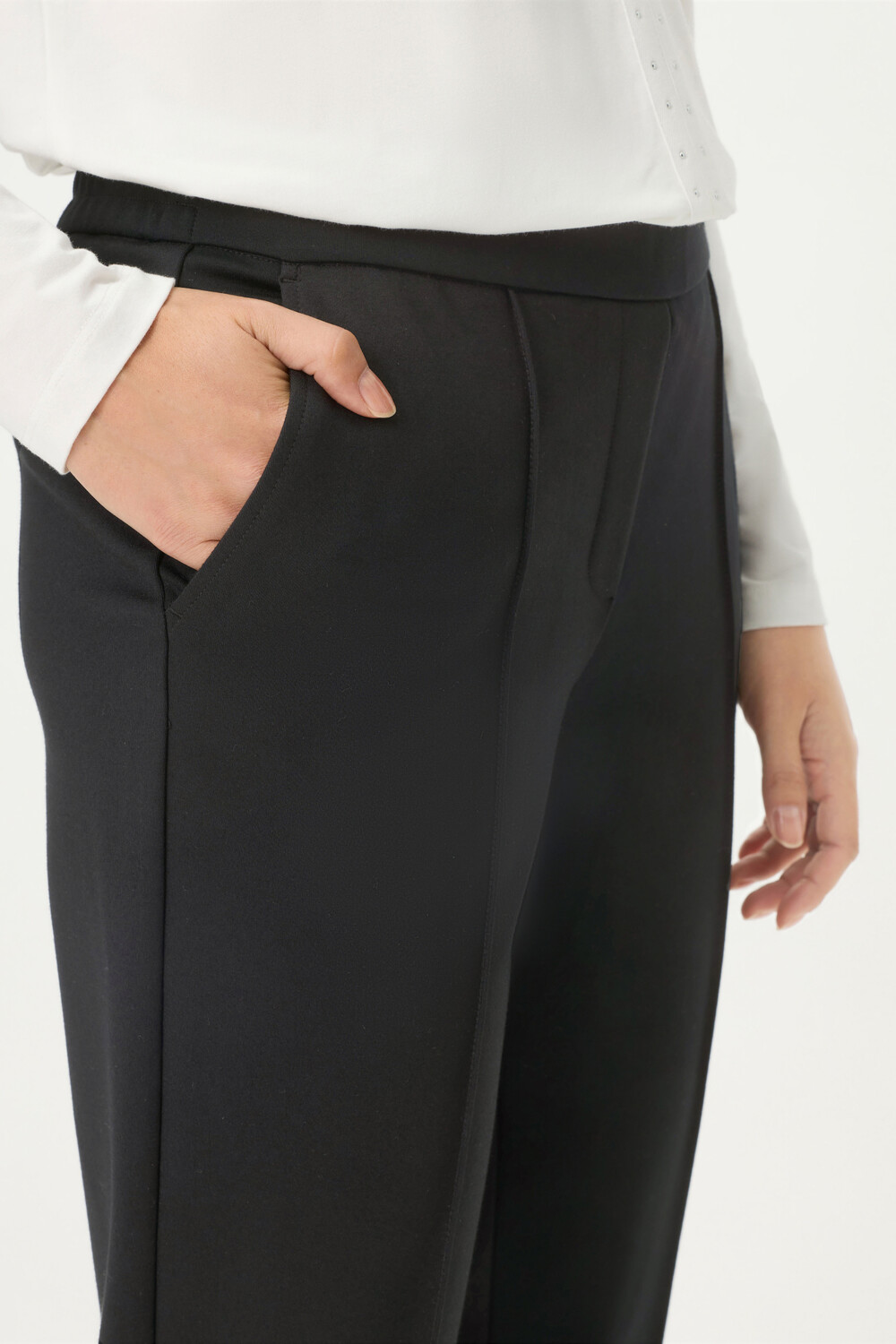 A great pair of trousers that are both comfortable and business-appropriate: simply slip them on and you’re done! These trousers are slightly cropped, feature a crease and turn-up at the bottom, and feature side pockets. These trousers are especially suitable for women with a slim to slightly feminine figure who prefer a straight fit and a modern mid-rise.