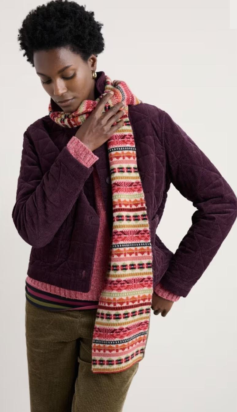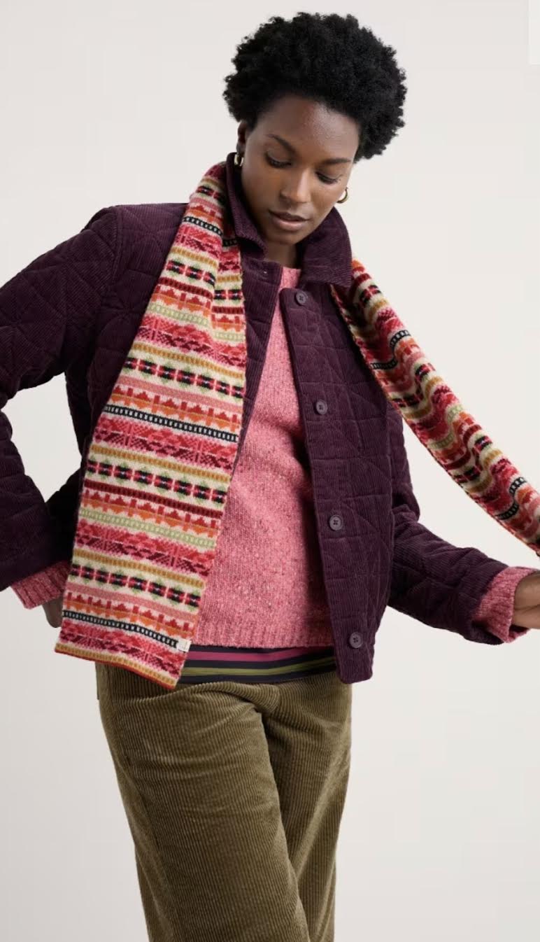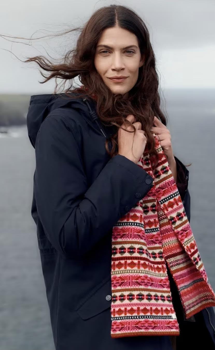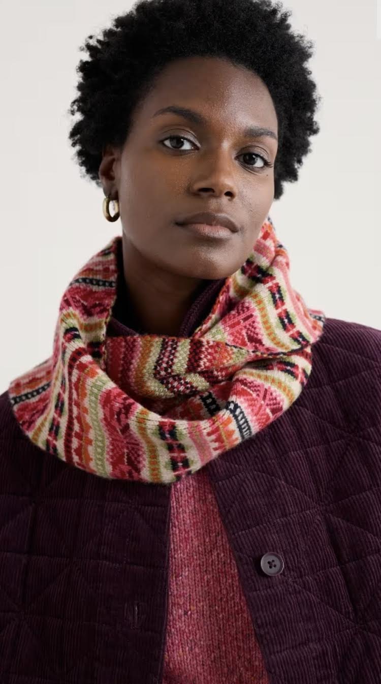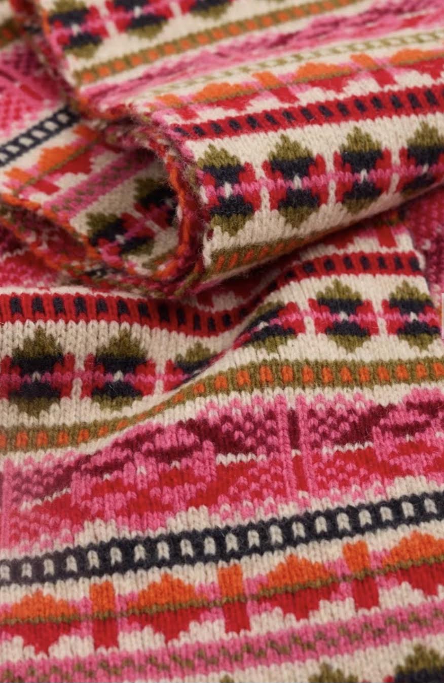 A soft scarf to brighten chilly days, with a vibrant Fair Isle pattern inspired by vintage cross stitch samplers. Made with a smooth 12 gauge jacquard knit, with a responsibly-sourced merino blend.