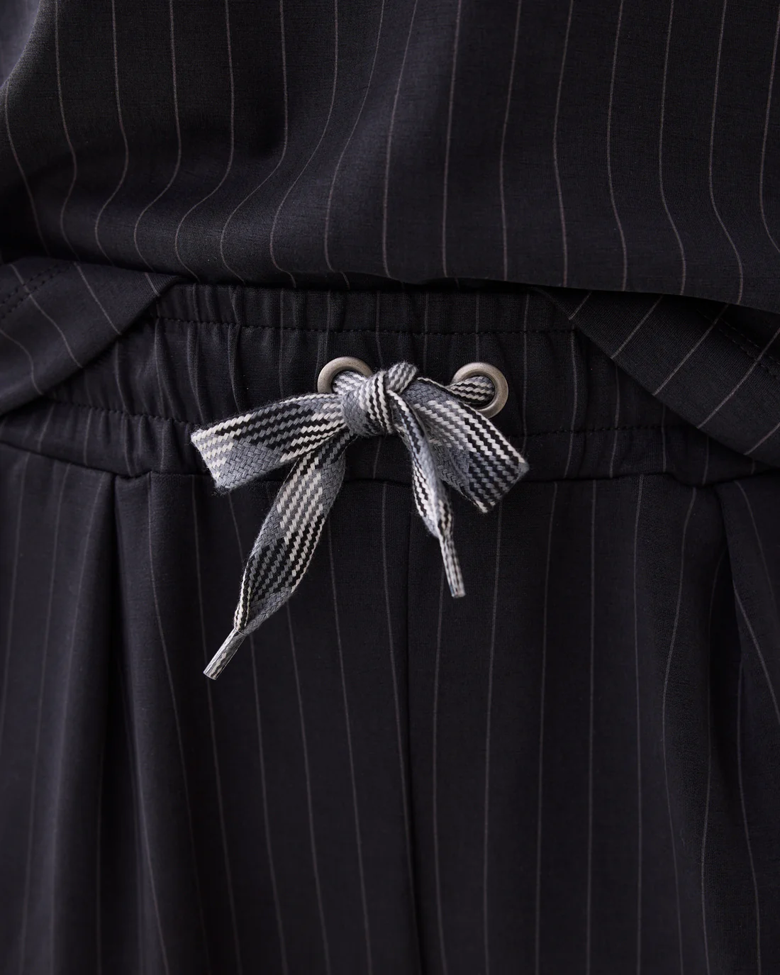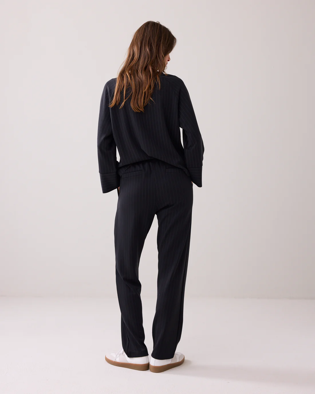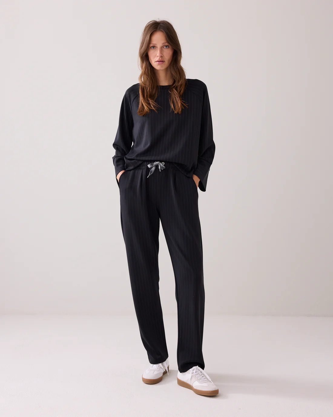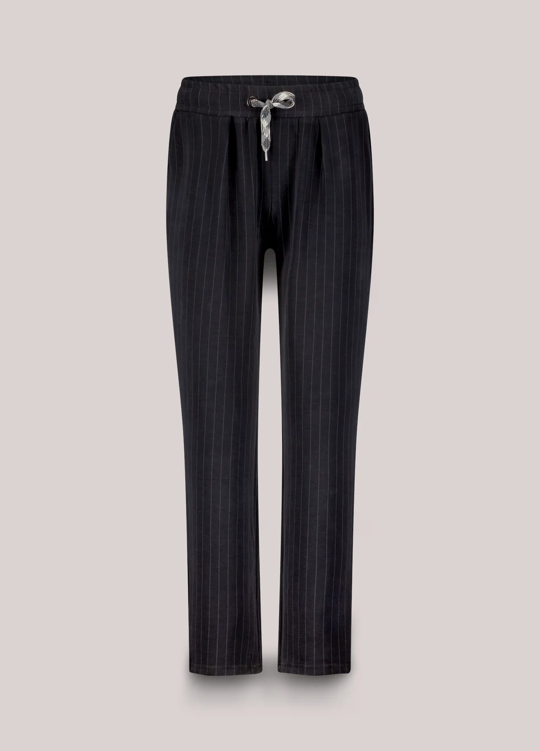 These sporty trousers feature a chic pinstripe and a relaxed fit. The trousers have an elasticated waist with a string and waistband pleats.